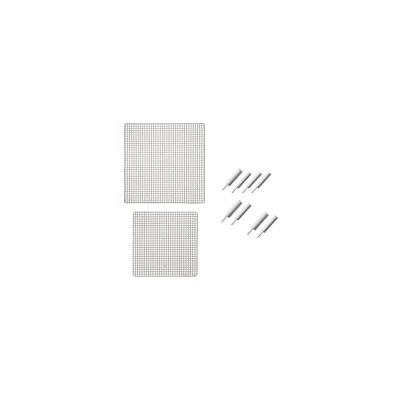 Kit de bandejas de cocción incluye:· 1 bandeja de porcelana 45x45 y una de 55x55mm· 4 pines de alúmina de 2mm.· 2 pines de alúmina de 3mm.· 2 pines de alúmina de 5mm.